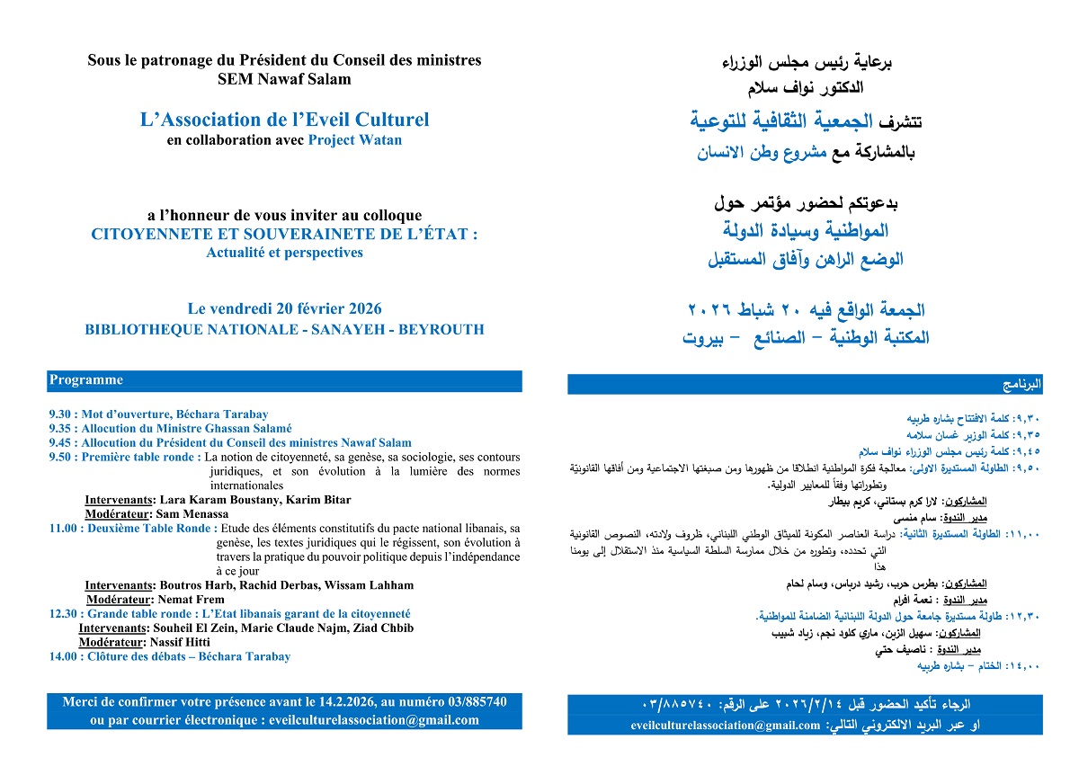 تستضيف المكتبة الوطنية-الصنائع في بيروت، يوم الجمعة 20 شباط (فبراير) 2026، مؤتمرًا دوليًا بعنوان “المواطنة وسيادة الدولة: الواقع، الآفاق، المستقبل”، تنظمه الجمعية الثقافية للتوعية بالتعاون مع “مشروع وطن”، وبرعاية رئيس مجلس الوزراء القاضي نواف سلام.
