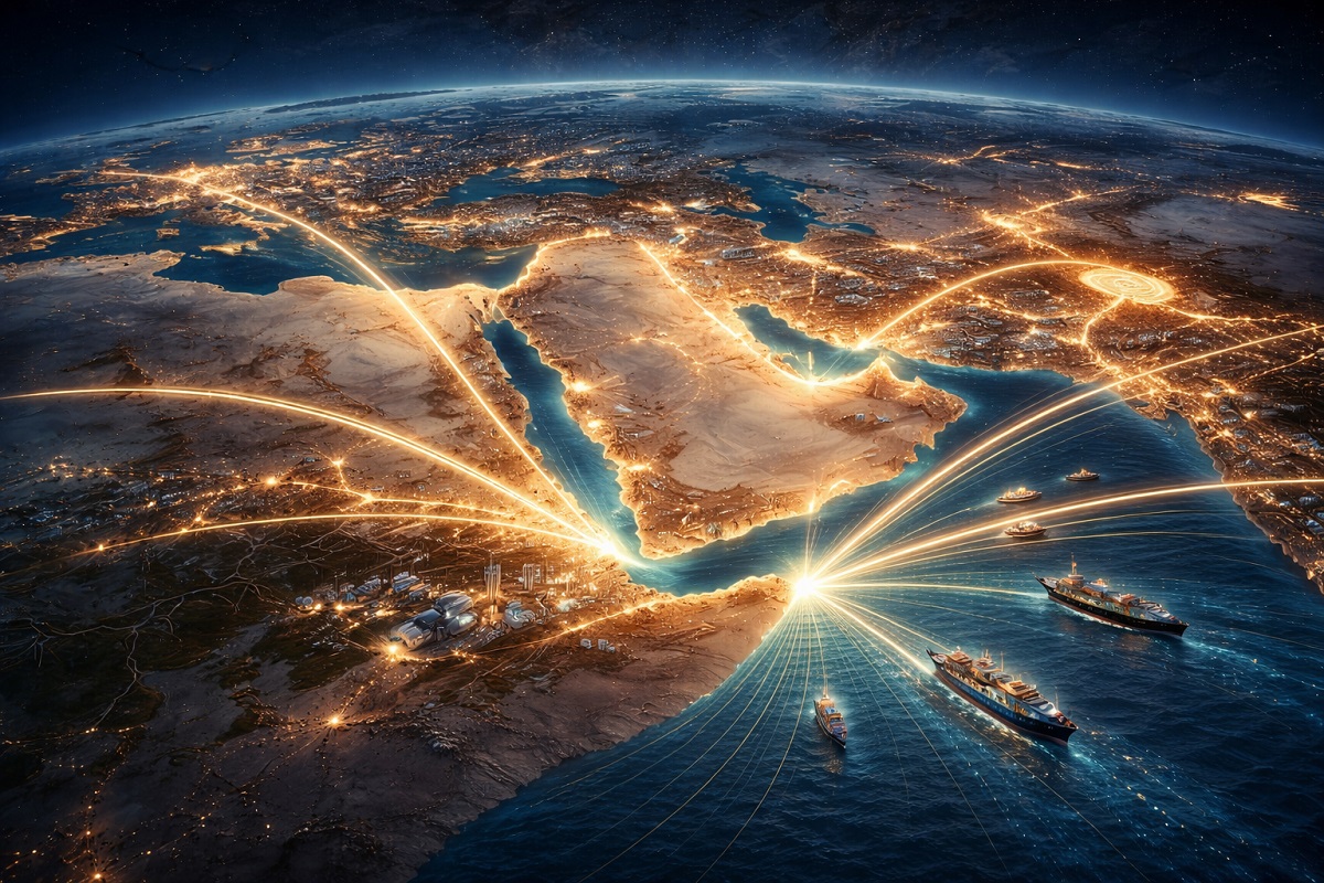 تستند أهمية الخليج إلى معطياتٍ جغرافية لا يمكن تجاهلها. فالمنطقة تقع عند تقاطع ثلاث قارات رئيسة هي آسيا وأفريقيا وأوروبا، وهو موقعٌ يمنحها مكانةً استثنائية في شبكة التجارة العالمية. كما تتحكّم دول الخليج في أحد أهم الممرات البحرية في العالم، وهو مضيق هرمز الذي يمرُّ عبره جُزءٌ كبير من تجارة النفط العالمية. وترتبط هذه الممرات البحرية بمساراتٍ أخرى حيوية مثل باب المندب والمحيط الهندي، ما يجعل الخليج محورًا أساسيًا في حركة الطاقة والتجارة الدولية.