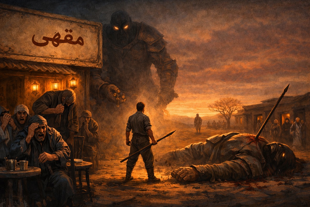 لما يئس الرجل من قومه، قرر أن يواجه الخوف وحده. فجلس متخفّيًا خلف باب المقهى، وفي يده رمح قصير، وعندما رأى المارد آتيًا من بعيد، وقف أمامه متحدّيًا، وهزَّ رمحه، وأرسله بأقصى ما يستطيع من إرادة، فاستقرَّ الرمحُ في صدر المارد، وخرَّ على ظهره صريعًا.