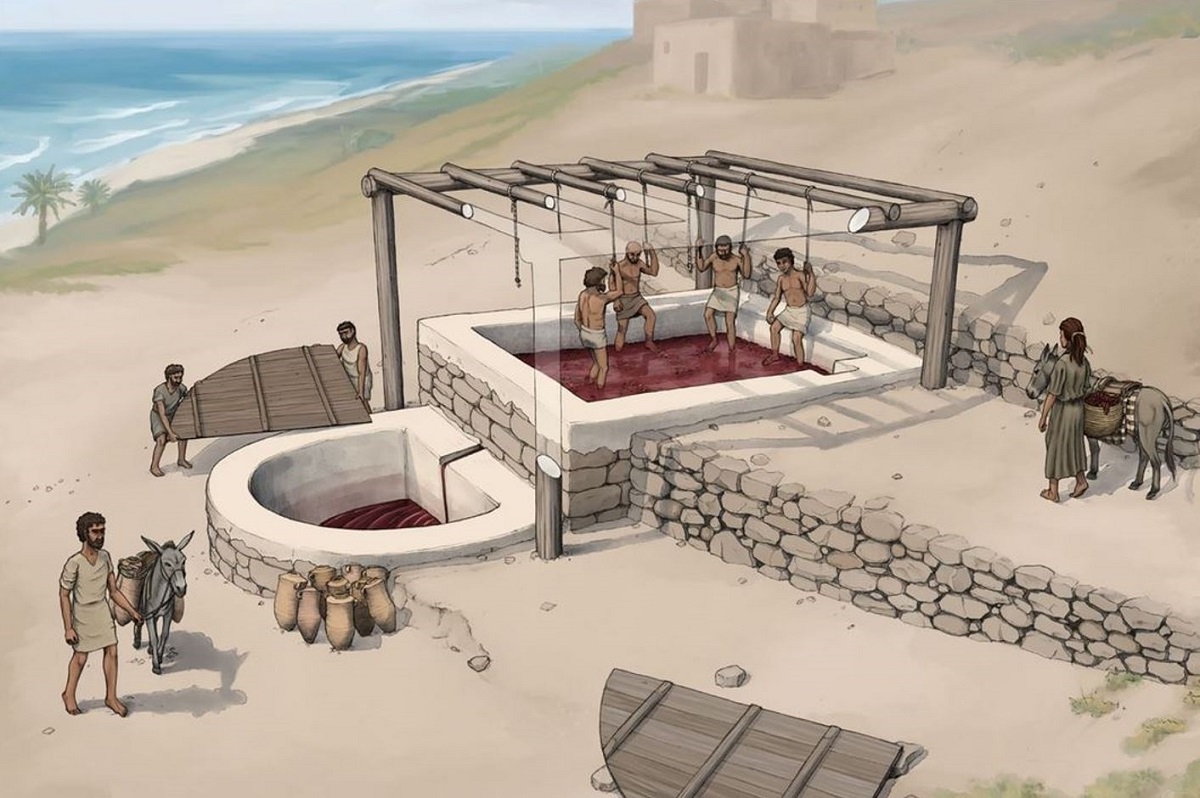 في هذه البقعة بالذات ظهرَت معصرة عنب لتصنيع النبيذ، مساحتُها نحو 8×4 أَمتار، منقسمة إِلى حيِّزَيْن مصنوعَين من الجص: أَوَّلُ منبَسَطٌ مرتفِعٌ قليلًا لدَوْس عناقيد العنب بالأَقدام، والآخَرُ نصفُ دائريٍّ أَدنى منه قليلًا كأَنما لتصبَّ فيه سوائلُ العنب العصور من المنبسَط الأَعلى.