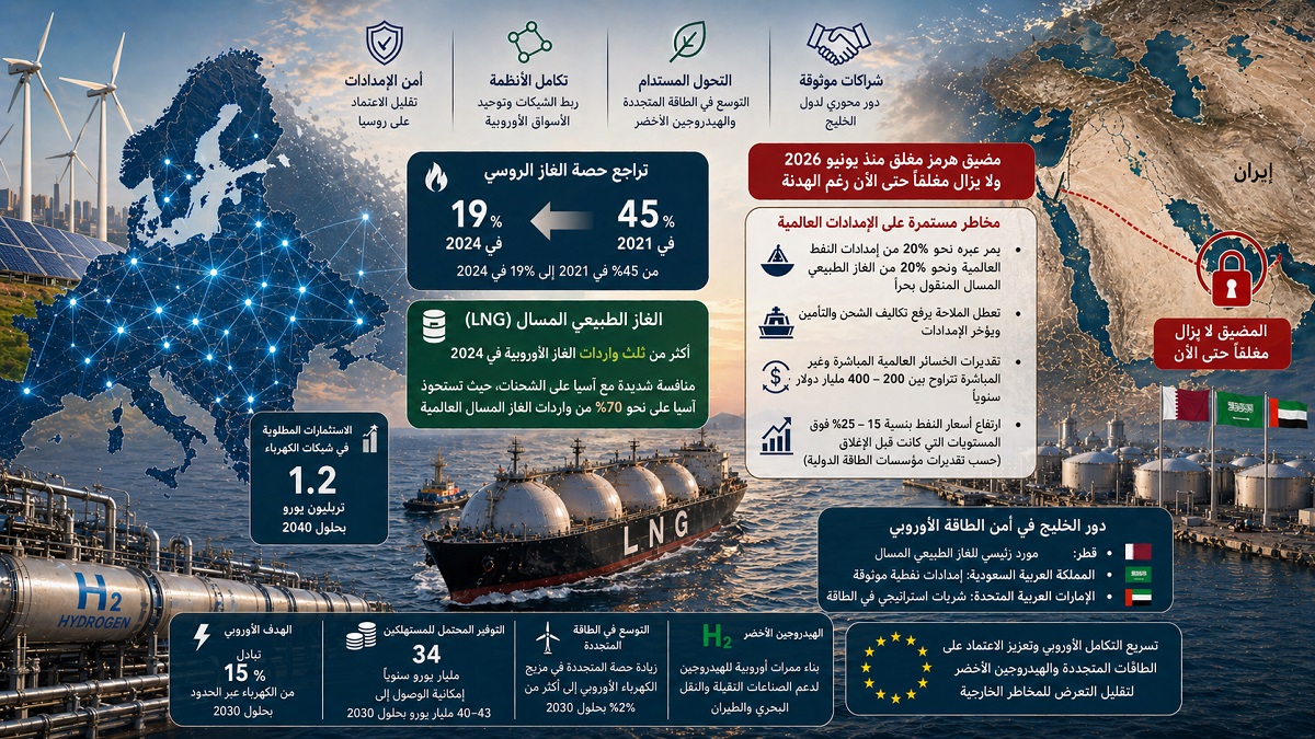 في موازاة الجهود الأوروبية الداخلية، يبقى استقرار أسواق الطاقة العالمية عاملًا حاسمًا في نجاح أي استراتيجية. وهنا يبرز دور الخليج العربي، الذي بات أحد الأعمدة الأساسية في تزويد أوروبا بالغاز الطبيعي المسال والنفط، مع صعود دول مثل قطر والمملكة العربية السعودية والإمارات العربية المتحدة كموردين رئيسيين في مرحلة ما بعد تراجع الدور الروسي.